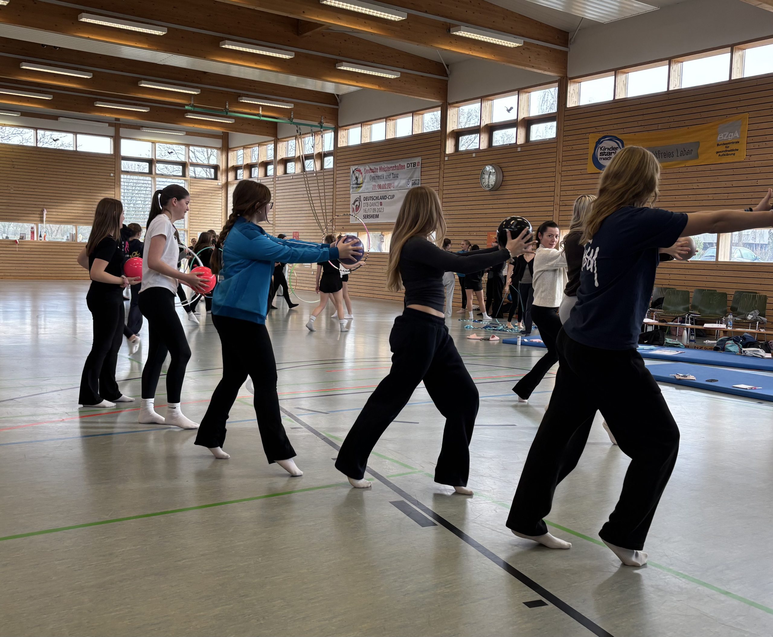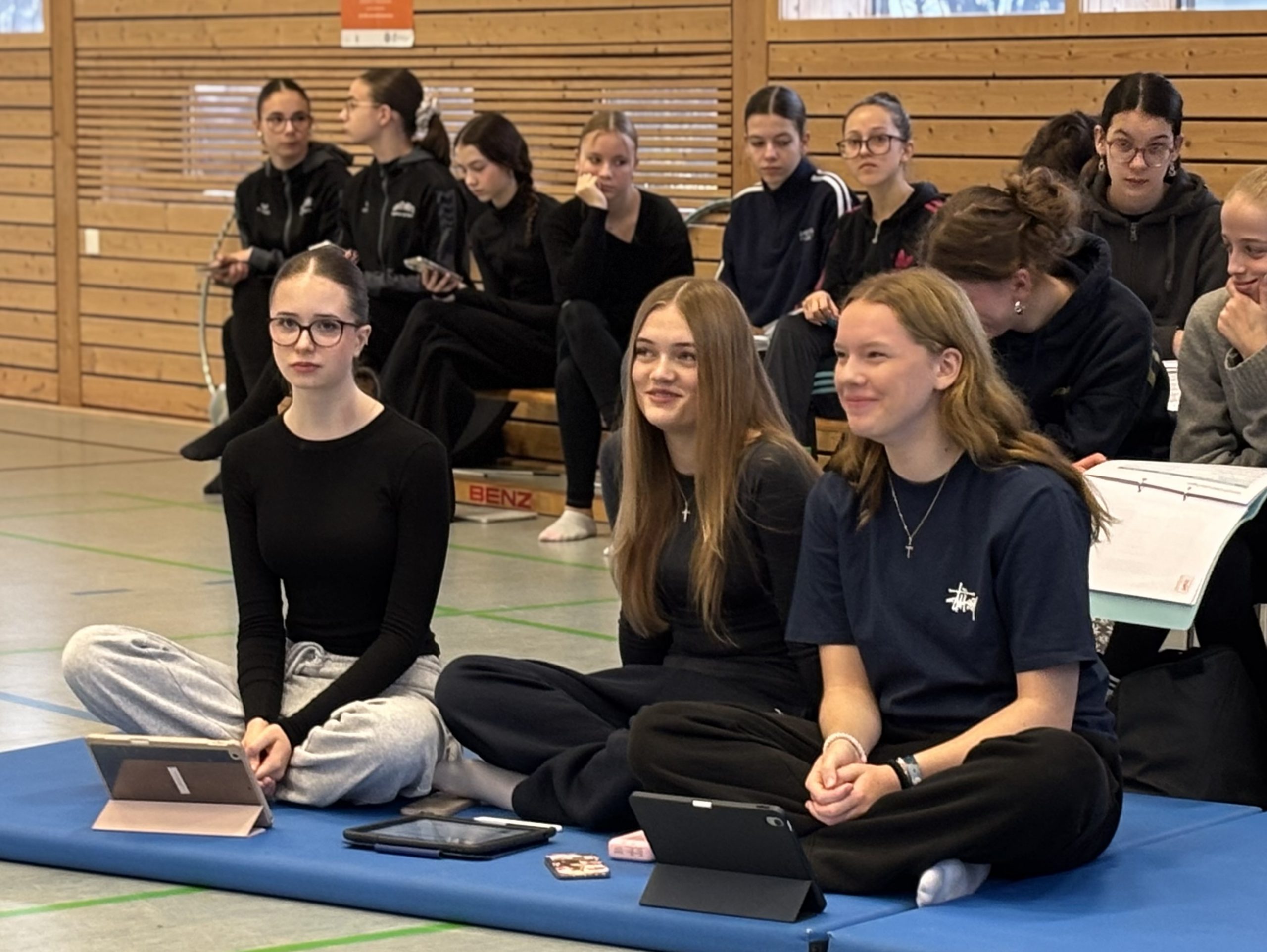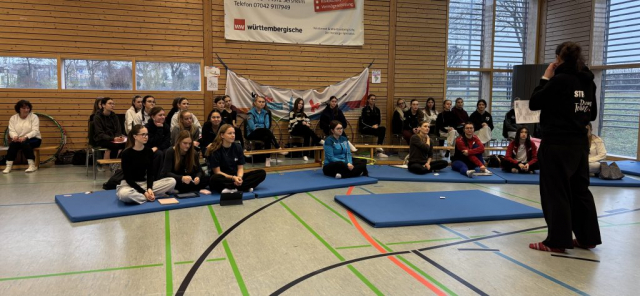Julia Babies, Ronja Ahrendt und Katharina Götz besuchten heute die Ausbildung zur Kampfrichter D-Lizenz im Fachgebiet Gymnastik/Tanz im Schwäbischen Turnerbund. Diese wurde in der Gymnastikhalle in Sersheim durchgeführt.