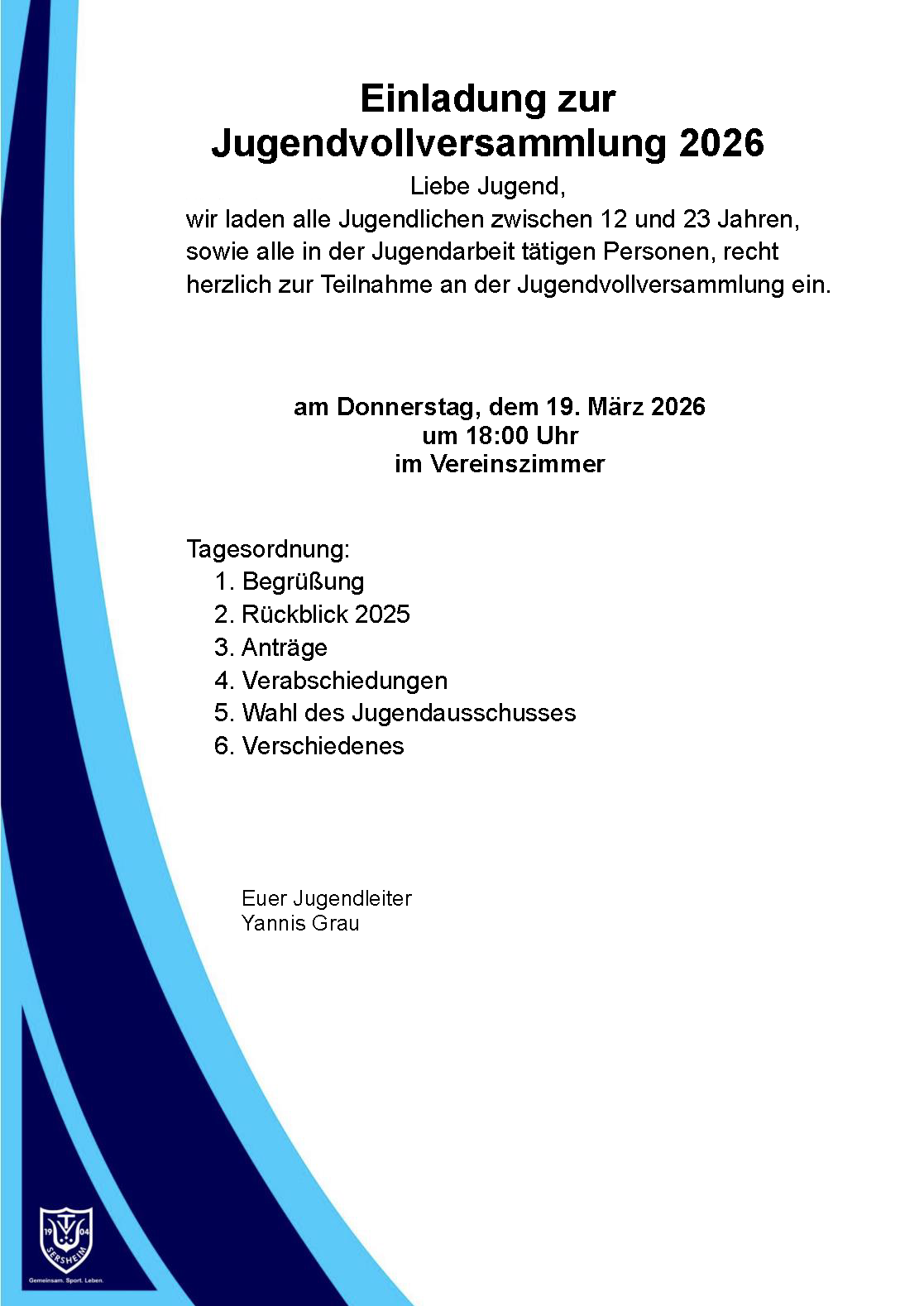 Jugendvollversammlung 2026 4. März 2026 Christian Babies Termin Details Datum: 19. März 2026 18:00 – 19:15 Ort: Vereinszimmer TV Sersheim Terminkategorien: Jugend, Jugendvollversammlung
