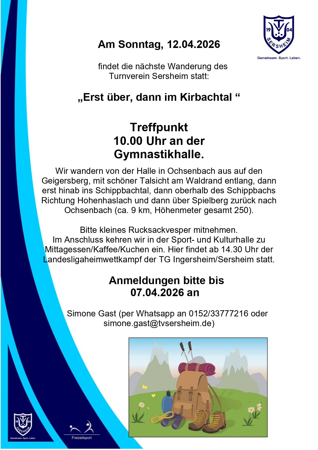 Wanderung „Erst über, dann im Kirbachtal“ 13. Januar 202618. März 2026 Selina Oelke Termin Details Datum: 12. April 2026 10:00 – 13:00 Terminkategorien: Wanderung
